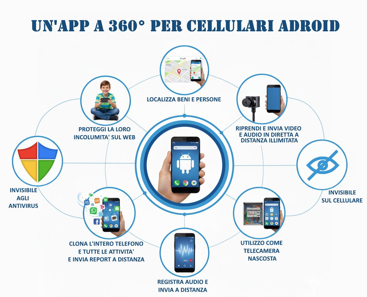 - Funziona su tutti i dispositivi Android e PC windows ed è invisibile ad antivirus e sulle app installate;